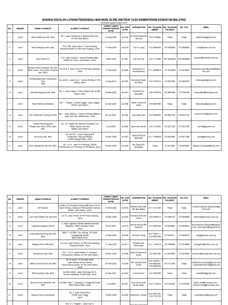 Kursus Latihan Pengendali Makanan Perinion Sdn Bhd No53a Jalan Laksamana 1 Taman Ungku Tun Aminah Skudai Johor Bahru 2020