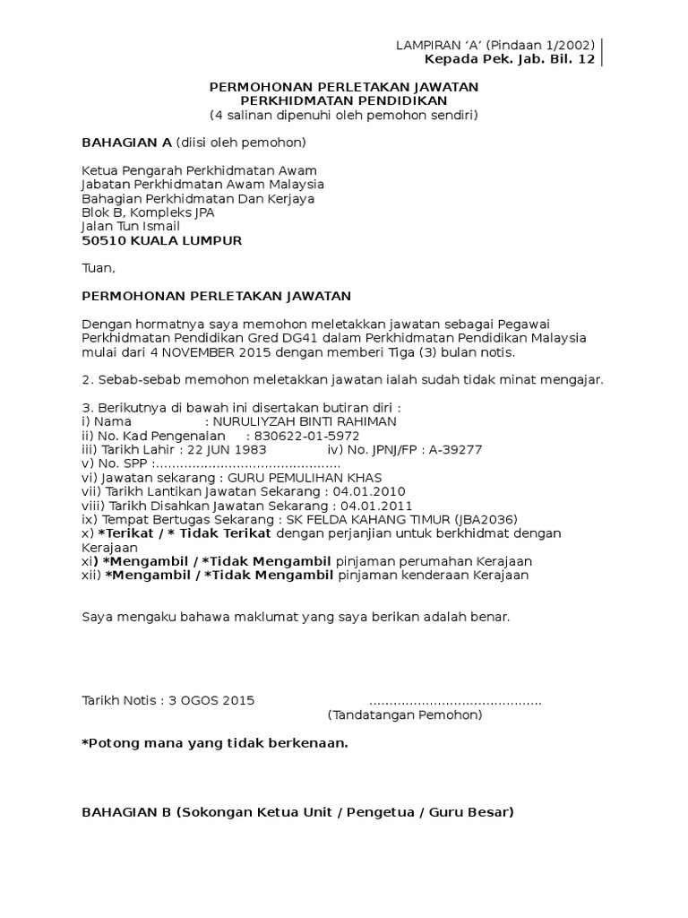 Contoh Surat Berhenti Kerja Surat Perletakan Jawatan