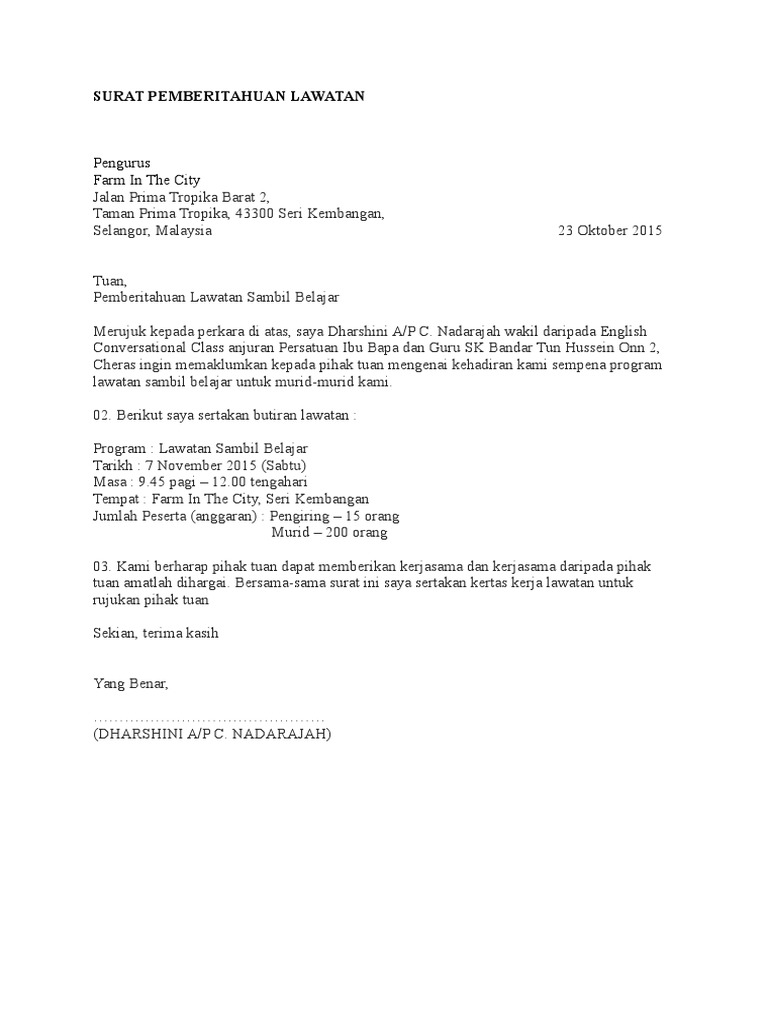 Contoh Karangan Surat Rasmi Lawatan Sambil Belajar Upsr Klaten Cc