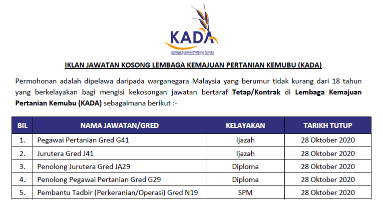 Jawatan Kosong Terkini Kada Lembaga Kemajuan Pertanian Kemubu Kerja Kosong Kerajaan Swasta