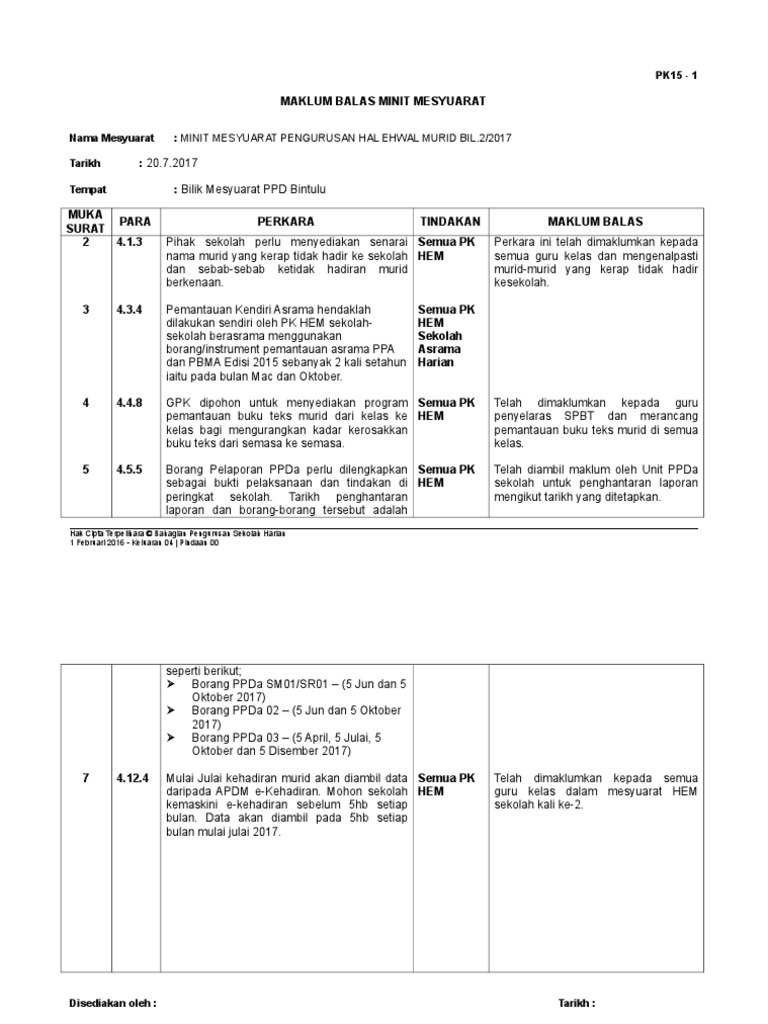 Contoh Maklum Balas Minit Mesyuarat Guru