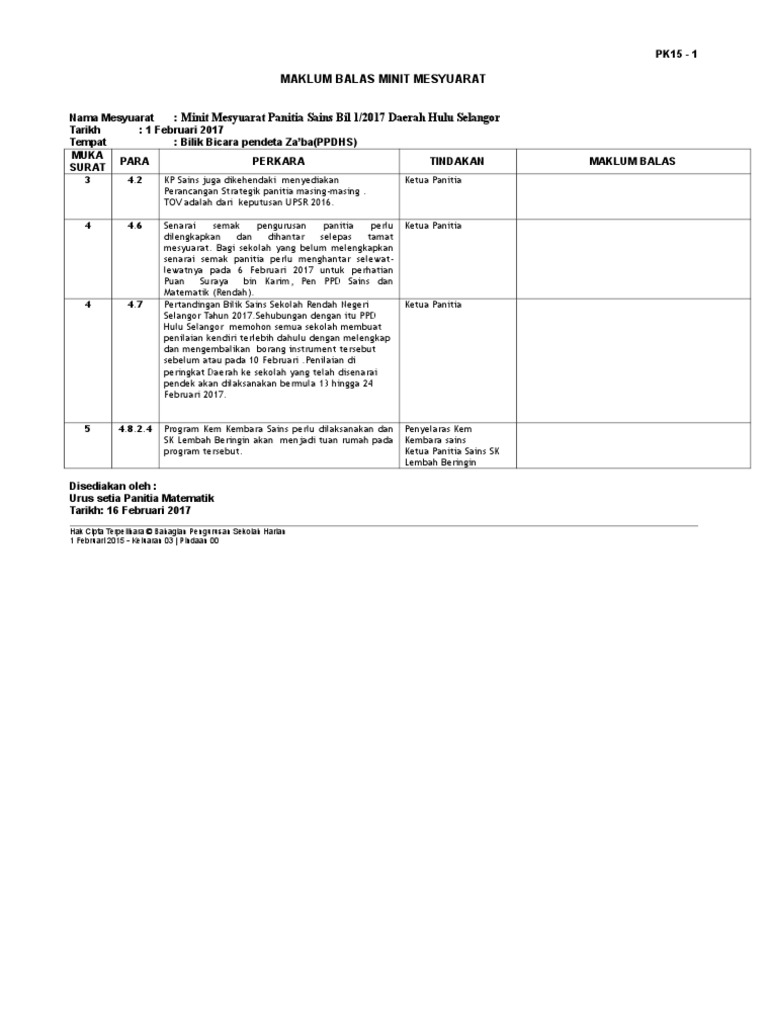 Borang Pk 07 5 Maklum Balas Minit Mesyuarat Kali Pertama 2017