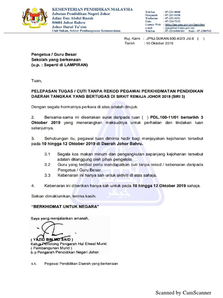 Surat Pelepasan Sirkit Remaja Johor Daerah Tangkak 2019