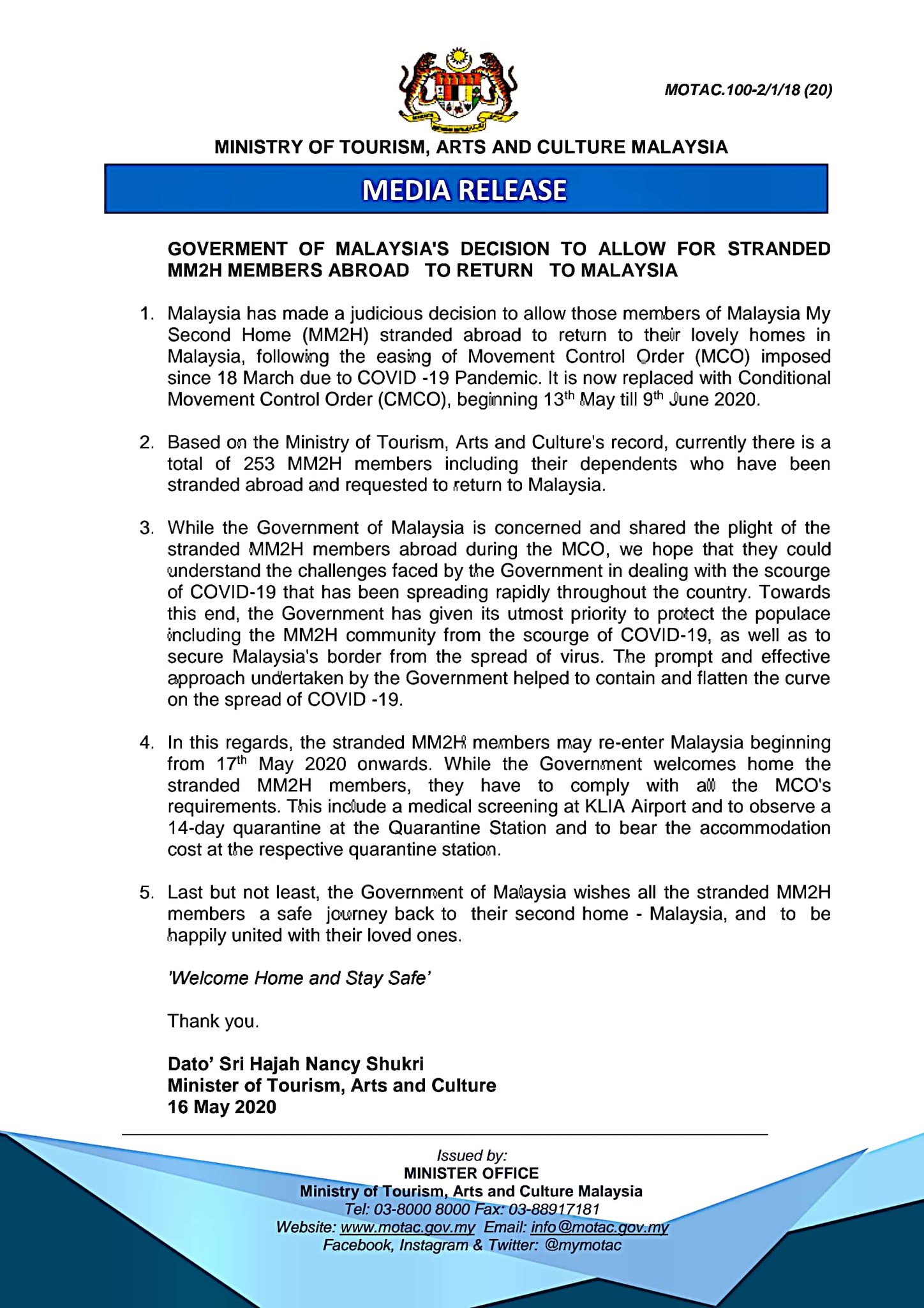 Hajah Nancy Haji Shukri Press Release Ministry Of Tourism Arts And Culture Malaysia 16 May 2020 Goverment Of Malaysia S Decision To Allow For Stranded Mm2h Members Abroad To Return To Malaysia
