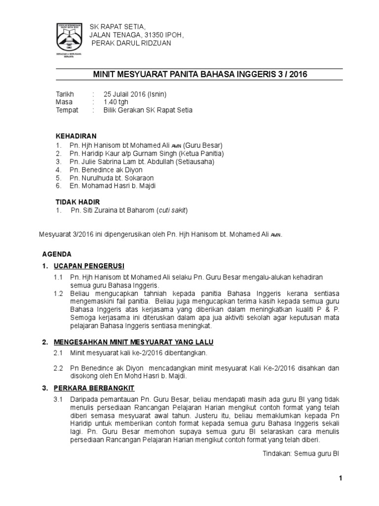 Minit Mesyuarat Panitia Sejarah Kali Pertama 2015 Sekolah Kebangsaan Kuala Bok Baram Tarikh 03 Febuari 2015 Selasa M Download Resume Resume Bambam